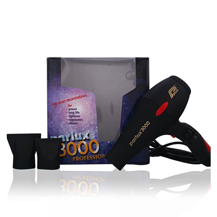 El PARLUX 3000 es la elección preferida de los profesionales de la peluquería por su durabilidad, eficiencia y diseño ergonómico. Su acabado en negro mate con toques rojos y dorados lo convierte en un accesorio elegante y potente.