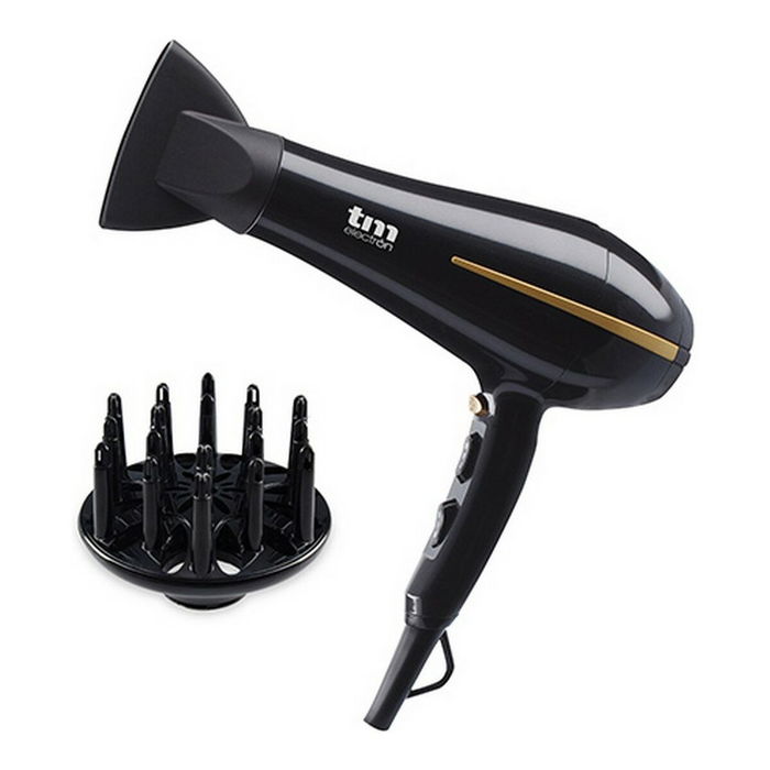 El secador de pelo TM Electron, presentado en un elegante color negro, ha sido diseñado para ofrecer un secado eficiente y profesional en el hogar o en el entorno de salón. Equipado con un motor potente de 2.000W a 2.400W, este secador garantiza un flujo de aire constante que permite secar y peinar el cabello en menos tiempo, adaptándose tanto a rutinas rápidas como a estilos más elaborados. Dispone de tres niveles de temperatura para personalizar el calor según el tipo de cabello y las necesidades de peinado, complementados con dos velocidades, facilitando así la selección óptima en cada uso. Incluye la opción de golpe de aire frío, ideal para fijar el peinado al finalizar y aportar un brillo natural a la melena. El difusor de aire contribuye a definir rizos y a aumentar el volumen, mientras que la boquilla concentradora permite precisión en el alisado o en el modelado de mechones concretos. Su diseño ergonómico y ligero, junto con un práctico cable de 2,3 metros y rejilla trasera extraíble para facilitar la limpieza, aseguran comodidad y durabilidad en el uso diario. El enchufe europeo facilita su integración en la mayoría de hogares y centros de belleza. Este modelo, con funciones ajustables y accesorios esenciales, proporciona un rendimiento versátil y fiable para quienes buscan resultados profesionales y cuidados en su rutina capilar.