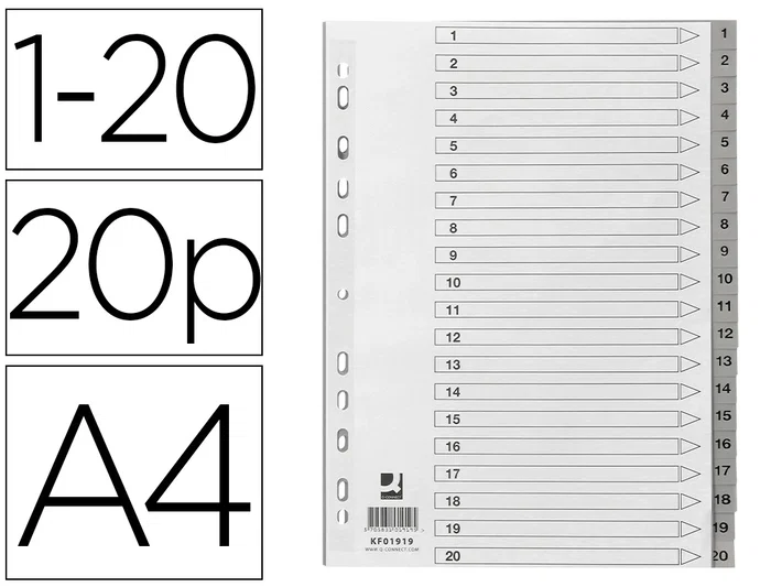 Q-connect Separadores Plástico 1-20 Din A4 Multitaladro Juego 20 Unidades Gris PVC