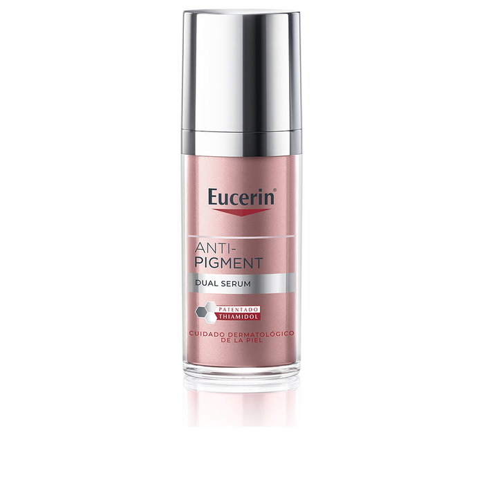 Descubre el sérum antimanchas ANTI-PIGMENT dual serum mono chamber de Eucerin. Este tratamiento innovador actúa eficazmente en la prevención y reducción de la pigmentación en tan solo dos semanas. Su fórmula potente contiene el ingrediente activo patentado Thiamidol, resultado de una década de investigación, que no solo combate las manchas sino que también promueve la renovación celular, ayudando a rellenar las arrugas y mejorar la textura de la piel. Obtén una piel más uniforme y radiante.