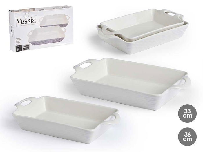 Vessia Set 2 Bandejas Rectangulares Asas Abiertas Porcelana Blanca 35.5x20x6 cm y 32.5x18x5.2 cm Apto Lavavajillas Horno Microondas (Set de 6)