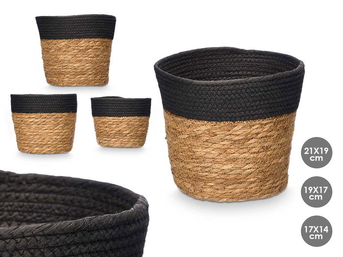 Giftdecor Set de 3 Cestos Redondos de Esparto, Altura 19 cm, Color Negro y Natural, 22x22 cm (Set de 6)