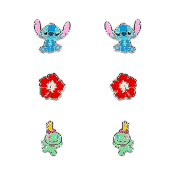 Disney Set 3 Pares de Pendientes Stitch y Scrump Bañados en Plata
