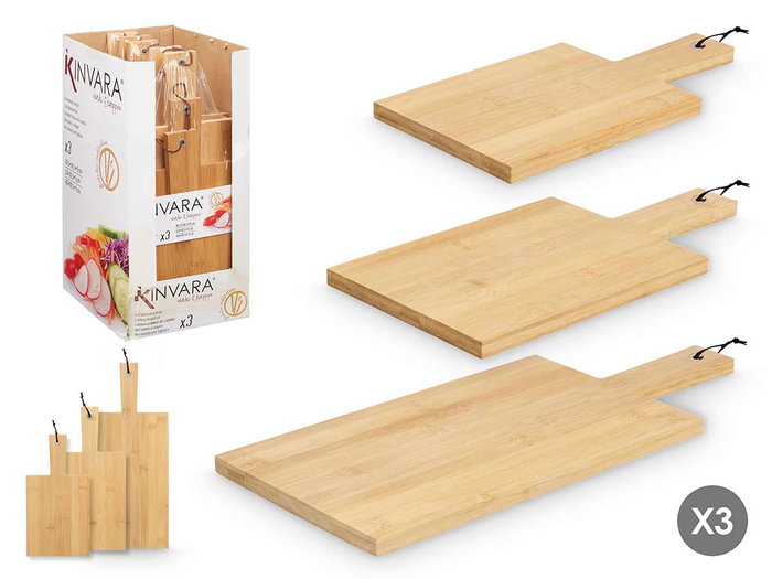 Kinvara Set 3 Tablas de Corte Asa Bambú con Detalles en Metal y Cuerda, Tabla Principal 40 x 4 x 18.5 cm, Otras Tablas 33 x 16.7 cm y 28.5 x 14.5 cm (Set de 12)