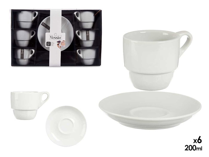 Vessia Set 6 Tazas de Café de Porcelana Blanca con Plato 200ml - Dimensiones Taza 10.2x7.5x7cm, Plato 14.7x14.7x1.5cm - Medida Exterior Set 22x8.5x36cm (Set de 6)