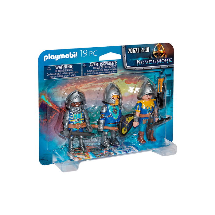 El juego contiene tres caballeros Novelmore con armadura y casco, escudo, espada, ballesta, estrella de la mañana y otros extras.