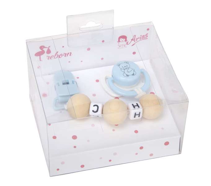 Muñecas Arias Set Chupete Azul/Blanco con Cadena de Bolas de Madera y Pinza Blanca