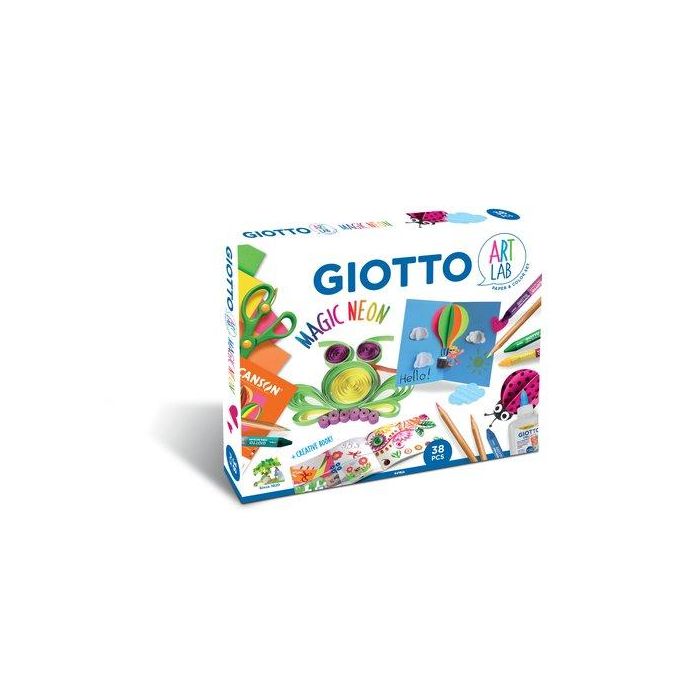 Set Juego Giotto Art Lab Magic Neon 12X Giotto Cera Bicolor 4X Giotto Pasteles En Colores Fluo (Amarillo, Rosa, Naranja Y Verde) 1X Giotto Collage Glue 120G 1X Tijera 1X Bloc De Cartulina Iris Canson Neon En Formato A4 Con 20 Hojas En Colores Neon (Amaril