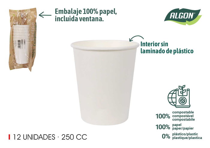 Algon Set 12 Vasos de Cartón Blancos 250cc (20 Unidades)