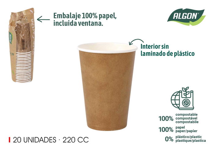 Algon Set 20 Vasos Cartón Kraft 220 cc 7 x 9.5 x 7 cm (20 Unidades)