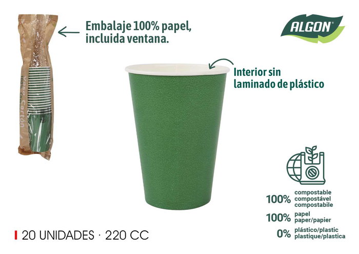 Algon Set 20 Vasos de Cartón Verde Pino 220 cc (20 Unidades)