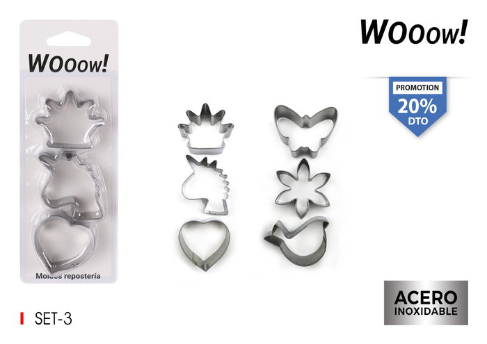 Wooow Set 3 Moldes Repostería Surtido Inox 19 cm Ancho 7 cm Alto 3 cm (36 Unidades)