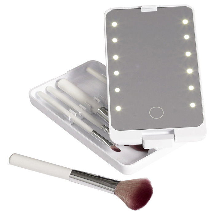 - Nómada y compacto, este espejo LED con pinceles es ideal para retoques de maquillaje. Gracias a su iluminación difusa, ninguna parte de tu rostro quedará en sombras.