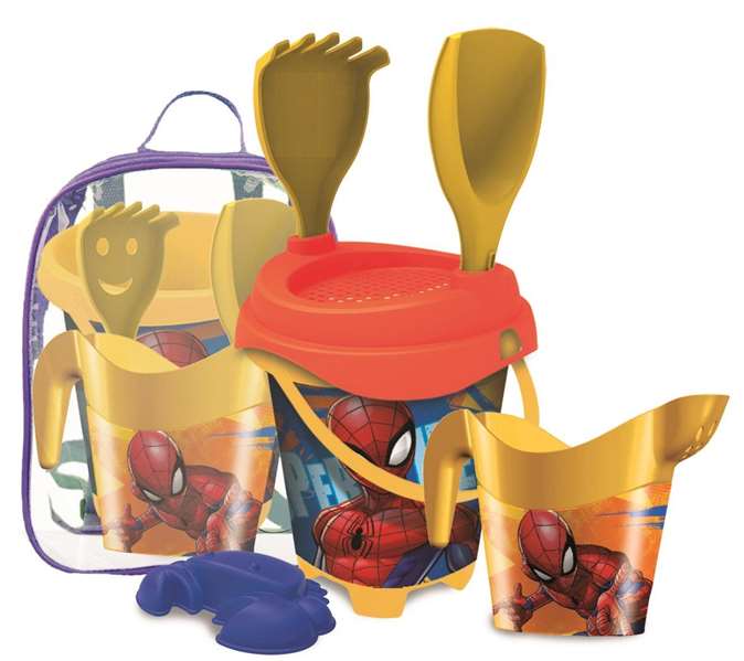 Mochila Cubo Playa Castillo Spiderman Con Cedazo, Pala, Rastrillo Y Moldes 18 Cm