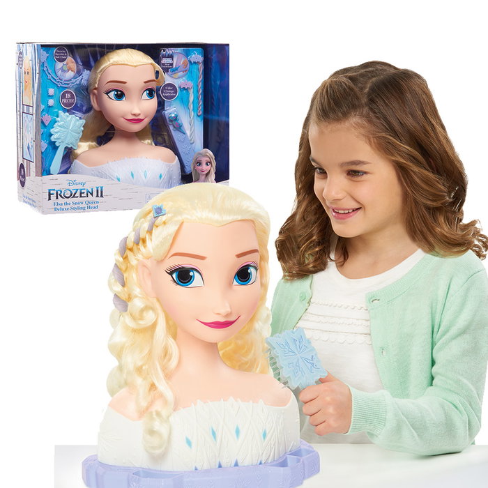 ¡Con el busto Deluxe de Elsa de la película Frozen de Disney, descubrirás un sinfín de maneras distintas de jugar con el pelo de la reina de la nieve! Elsa tiene una linda cabellera rubia y brillante, perfecta para cepillar y peinar. El busto de Elsa viene con 18 accesorios, entre ellos: cinta para el pelo, 2 extensiones de pelo que cambian de color, 2 peines personalizables, 6 clips de pelo, 4 gomas, un cepillo con forma de copo de nieve y un aplicador con forma de varita mágica para hacer cambios de color con bandeja.¡El busto Deluxe de Elsa también incluye un copo de nieve en el vestido que cambia de color con el agua! Usa las extensiones de pelo que cambian de color para hacer bonitas trenzas o haz una cola a Elsa con la cinta incluida. ¡Personaliza los peines de Elsa con los clips incluidos para un estilo todavía más sofisticado! ¡También es muy divertido usar los accesorios incluidos para peinar tu propio pelo!