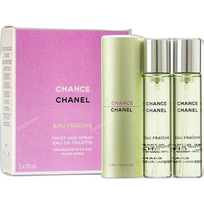Sumérgete en la frescura y la alegría con el CHANEL CHANCE EAU FRAÎCHE edt vaporizador twist & spray. Este set incluye un vaporizador de 20 ml y dos recargas, ideal para llevar contigo a donde quiera que vayas.