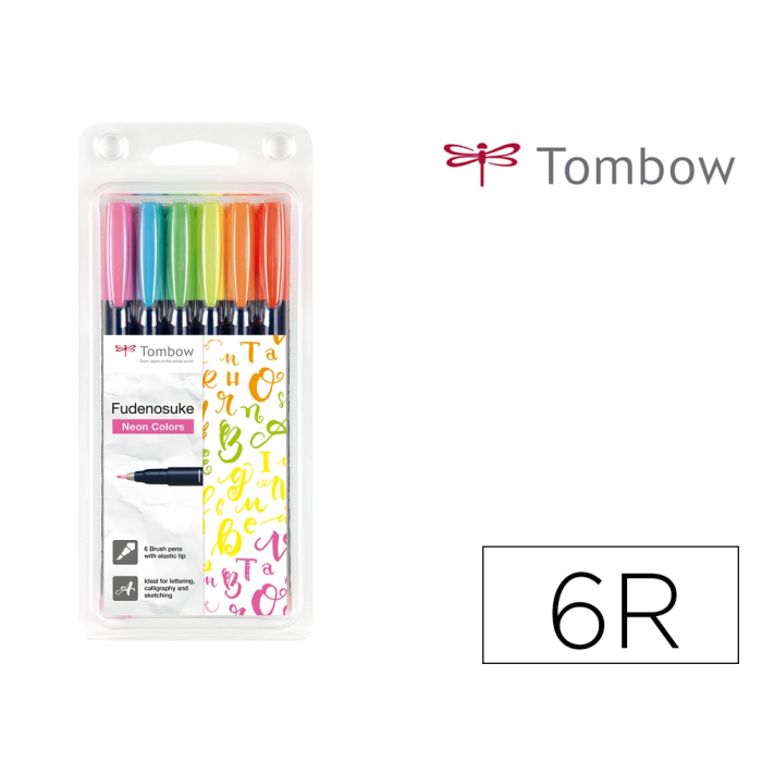 Rotulador Tombow Caligrafia Fudenosuke Punta Dura Estuche De 6 (Colores Neon: Rosa, Amarillo, Verde, Naranja, Rojo Y Azul)