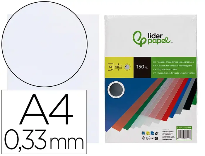 Hoja de polipropileno extrusionado ligeramente rugoso para encuadernación de espiral, canutillo, anillas y otros.