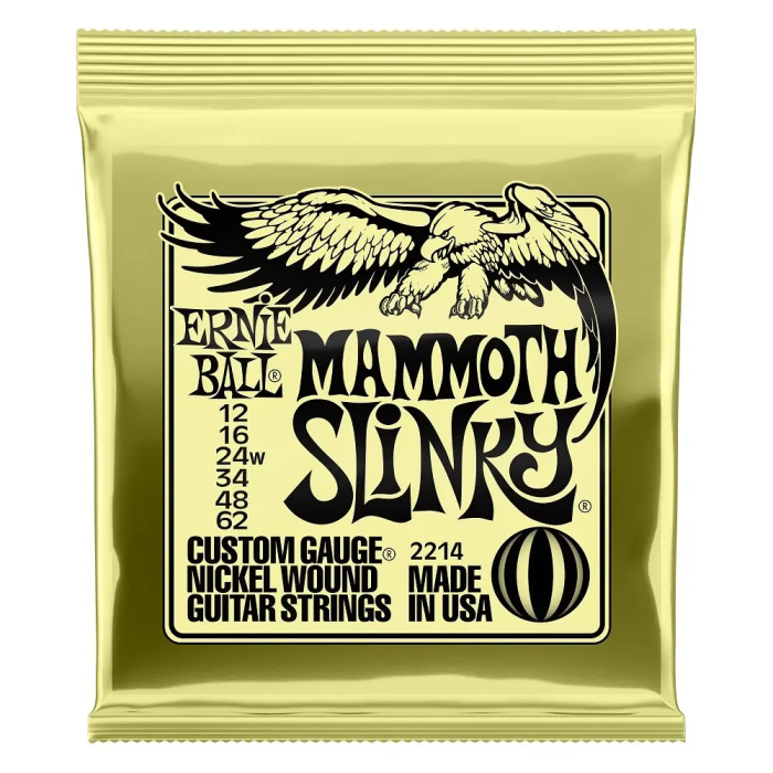 Ernie Ball da la bienvenida las nuevas Mammoth a su familia de cuerdas Slinky. Este nuevo y poderoso juego ha sido específicamente desarrollados y configurado para afinaciones ultra bajas, incluyendo Drop A, B o C. Una nueva propuesta de Ernie Ball para aquellos guitarristas que prefieren un juego de cuerdas más contundente y con un sonido ?brutalmente? grueso con tensión y definición óptimas. Configuración de calibres: 12, 16, 24, 34, 48, 62