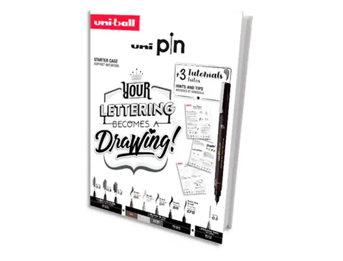 PIN es un rotulador calibrado Punta de poliacetal Tinta pigmentada de granresistencia al agua, que hace que una vez seca, no se pueda borrar Ideal para el dibujo profesional, artístico y para la escritura, ofreciendo un trazo nítido y suave a la vez. Kit de inicación al Lettering que incluye loesencial para empezar. Una selección de 8 puntas Uni Pin calibradas, un p ortaminas Shalaku S y 3 tutoriales paso a paso con explicaciones detalladas. Aprende a crear compsiciones, dibujas letras y decorarlas. ¡Ideal para regalo!
