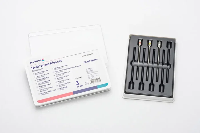 Hedstromfiles de Covetrus, utilizados para ensanchar el tercio oclusal del canal y para alisar las paredes de la preparación. Longitud de 60 mm, especificamente fabricada para Salud Animal. Juego con 3 unidades (#45-50-55).