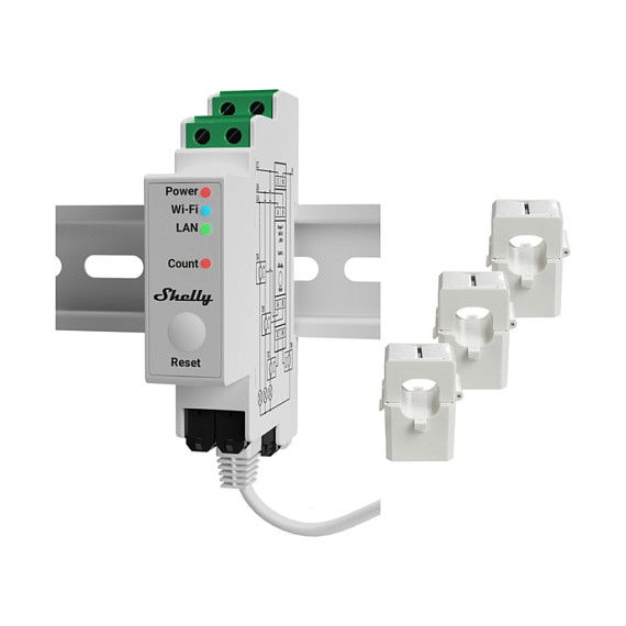Shelly Relé Pro 3EM 120A, Medidor de Energía WLAN/LAN, con Función de Medición Bluetooth, 3x Pinzas de 120A, para Rail DIN
