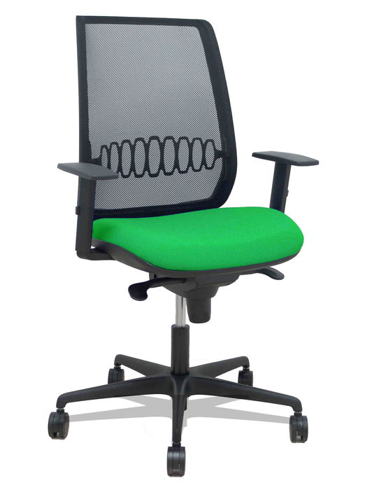 Silla de oficina Alares con mecanismo Sincro tapizada con Tela color Verde y malla color Negro. Equipada con lumbar 1D, Brazos 1D y Ruedas 65mm nailon
