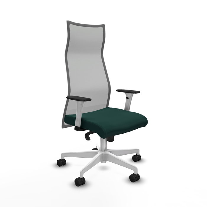 Sillón Albacete con mecanismo Sincro tapizada con Similpiel color Verde botella y malla color Gris. Equipado con Base poliamida blanca, Brazos 1D y Ruedas 65mm nailon