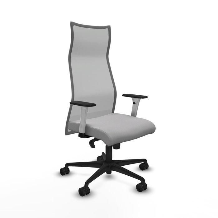 Sillón Albacete con mecanismo Sincro tapizada con Tela color Gris claro y malla color Gris. Equipado con Base nailon negra, Brazos 1D y Ruedas 65mm nailon
