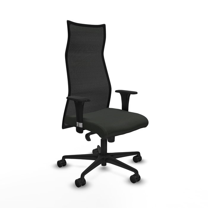 Sillón Albacete con mecanismo Sincro tapizada con Tela color Negro. Equipado con Base nailon negra, Brazos 1D y Ruedas 65mm nailon