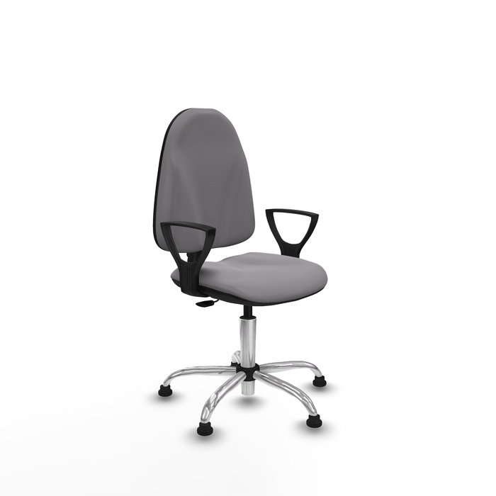 Equipada con ruedas tope de nailon y un perno de 11 mm de diámetro, esta silla giratoria para escritorio garantiza movilidad y estabilidad. Su base metálica cromada de 5 radios, con un diámetro de 60 cm, aporta resistencia y un acabado elegante que se adapta a cualquier ambiente profesional.