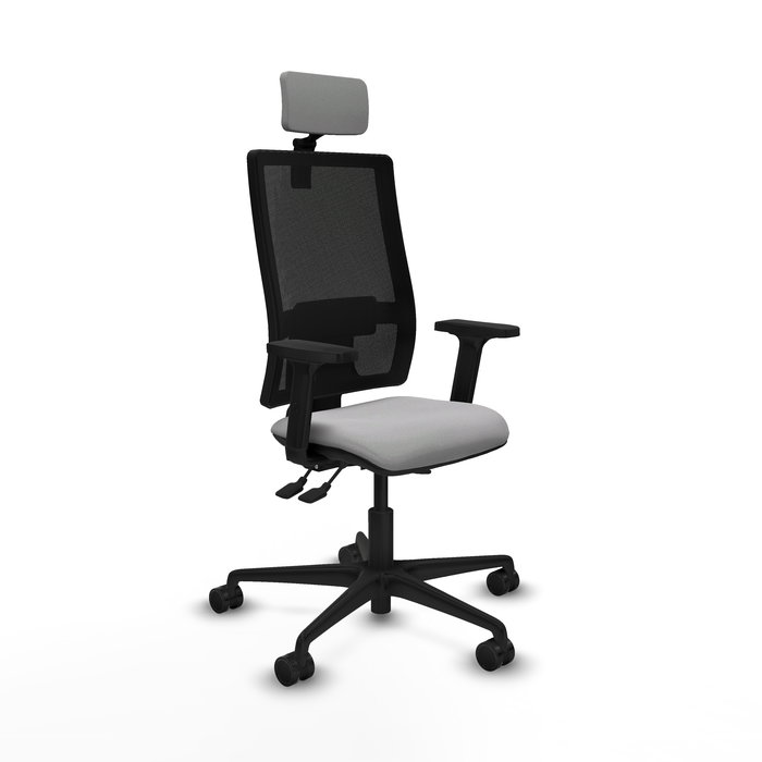 Silla de oficina Bormate con mecanismo Asincro tapizada con Tela color Gris claro y malla color Negro. Equipada con lumbar 1D, Brazos 2D, Cabecero 2D y Ruedas 65mm nailon