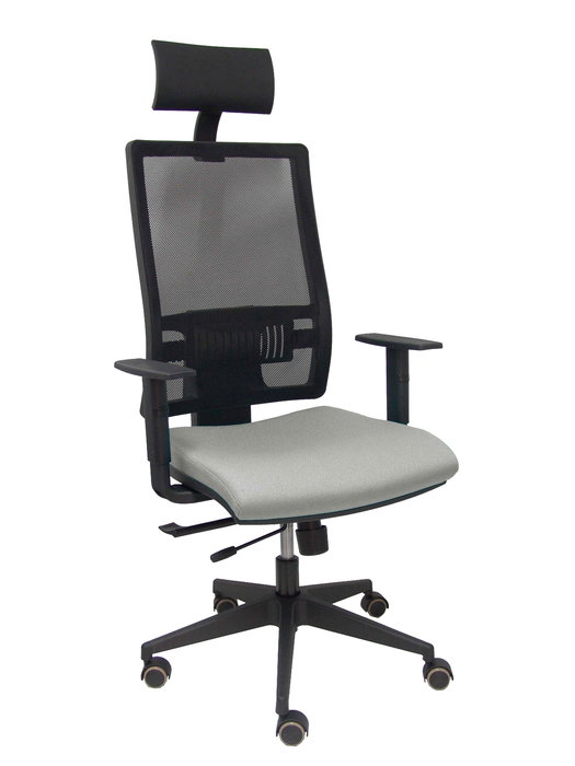 Silla de oficina Horna con mecanismo Sincro/Traslack tapizada con Tela color Gris claro y malla color Negro. Equipada con lumbar 1D, Brazos 1D, Cabecero Fijo y Ruedas de parqué