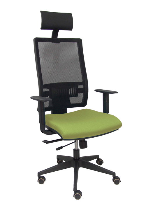 Silla de oficina Horna con mecanismo Sincro/Traslack tapizada con Tela color Verde oliva y malla color Negro. Equipada con lumbar 1D, Brazos 1D, Cabecero Fijo y Ruedas de parqué