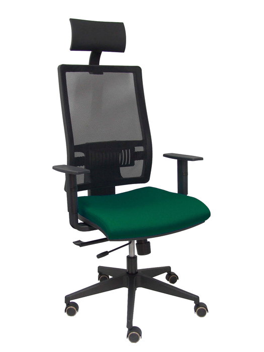 Silla de oficina Horna con mecanismo Sincro/Traslack tapizada con Tela color Verde botella y malla color Negro. Equipada con lumbar 1D, Brazos 1D, Cabecero Fijo y Ruedas de parqué