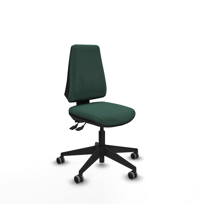 Silla de oficina Elche con mecanismo Asincro tapizada con Tela color Verde botella. Equipada con Base piramidal negra, Sin brazos y Ruedas 65 mm parqué