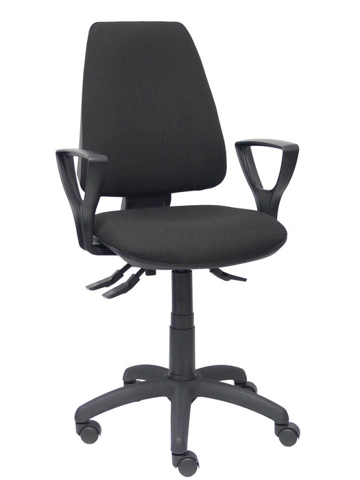 Silla de oficina Elche con mecanismo Asincro tapizada con Tela color Negro. Equipada con Base poliamida negra, Brazos fijos y Ruedas de nailon 50 mm