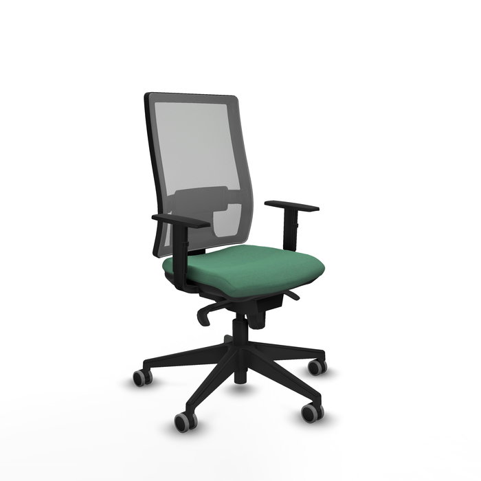 Silla de oficina Horna con mecanismo Sincro tapizada con Tela color Verde esmeralda y malla color Gris. Equipada con lumbar 1D, Brazos 1D y Ruedas 65 mm parqué