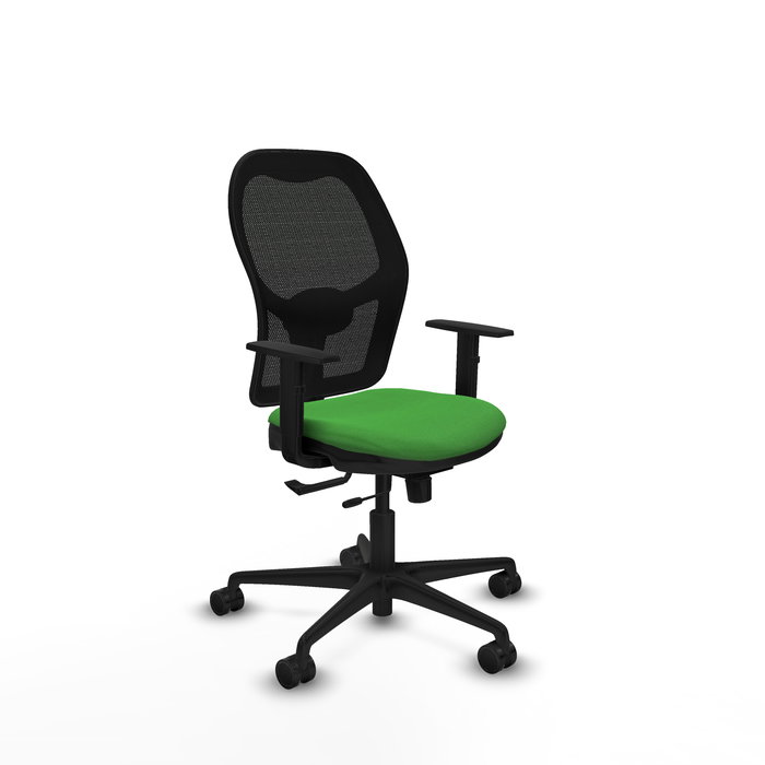 Silla de oficina Jorquera con mecanismo Sincro/Traslack tapizada con Tela color Verde y malla color Negro. Equipada con lumbar 1D, Brazos 1D y Ruedas 65mm nailon