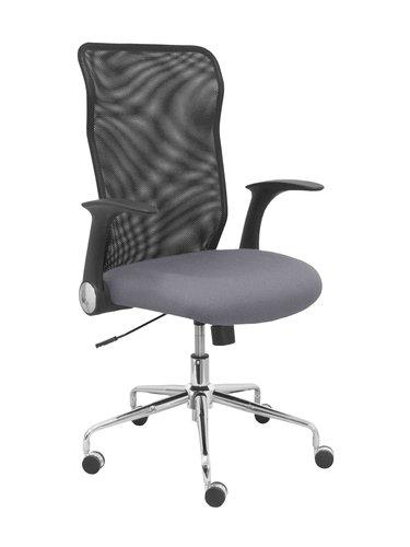 Silla de oficina Minaya con mecanismo Basculante tapizada con Tela color Gris y malla color Negro. Equipada con Base cromada, Brazos abatibles y Ruedas de nailon 50 mm