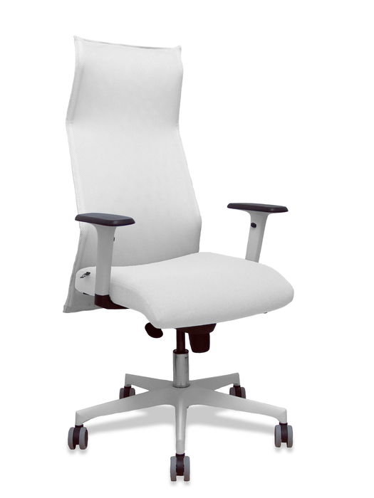 Sillón Albacete con mecanismo Sincro tapizada con Tela color Blanco. Equipado con Base poliamida blanca, Brazos 1D y Ruedas 65 mm parqué