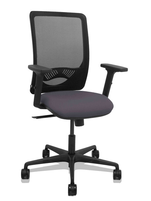Silla de oficina Zulema con mecanismo Sincro tapizada con Tela color Gris oscuro y malla color Negro. Equipada con lumbar 1D, Brazos 2D y Ruedas 65mm nailon