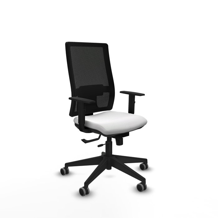 Silla de oficina Horna con mecanismo Sincro/Traslack tapizada con Tela color Blanco y malla color Negro. Equipada con lumbar 1D, Brazos 1D y Ruedas 65 mm parqué