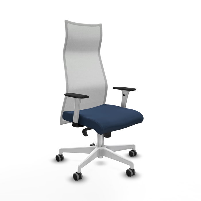 Sillón Albacete con mecanismo Sincro tapizada con Similpiel color Azul marino y malla color Blanco. Equipado con Base poliamida blanca, Brazos 1D y Ruedas 65 mm parqué