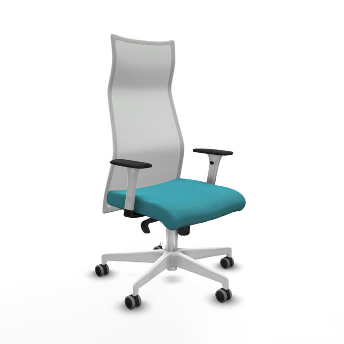 Sillón Albacete con mecanismo Sincro tapizada con Tela color Turquesa y malla color Blanco. Equipado con Base poliamida blanca, Brazos 1D y Ruedas 65 mm parqué