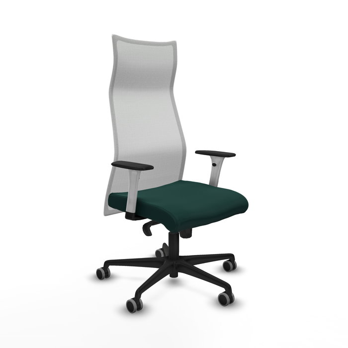 Sillón Albacete con mecanismo Sincro tapizada con Similpiel color Verde botella y malla color Blanco. Equipado con Base nailon negra, Brazos 1D y Ruedas 65 mm parqué