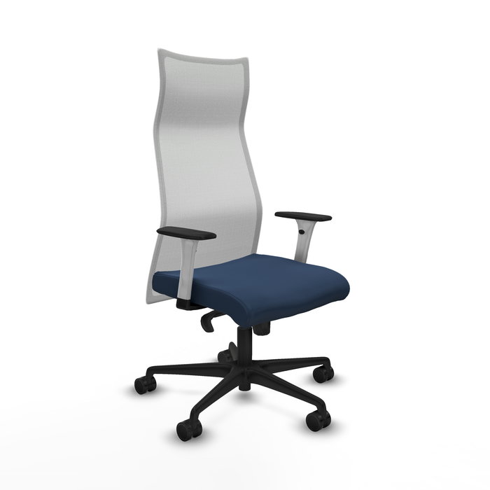 Sillón Albacete con mecanismo Sincro tapizada con Similpiel color Azul marino y malla color Blanco. Equipado con Base nailon negra, Brazos 1D y Ruedas 65mm nailon