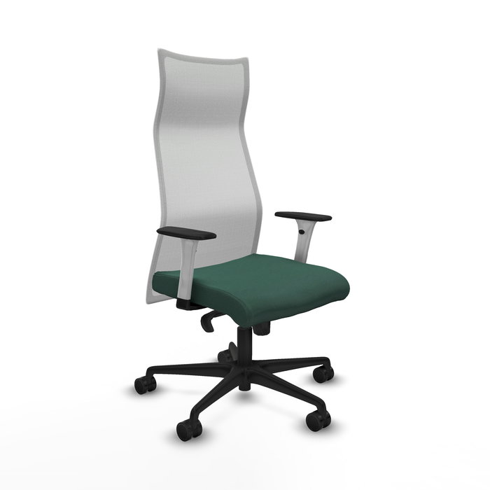 Sillón Albacete con mecanismo Sincro tapizada con Tela color Verde botella y malla color Blanco. Equipado con Base nailon negra, Brazos 1D y Ruedas 65mm nailon