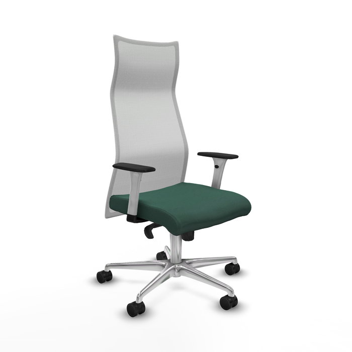 Sillón Albacete con mecanismo Sincro tapizada con Tela color Verde botella y malla color Blanco. Equipado con Base aluminio, Brazos 1D y Ruedas 65mm nailon