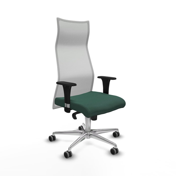 Sillón Albacete con mecanismo Sincro tapizada con Tela color Verde botella y malla color Blanco. Equipado con Base aluminio, Brazos 1D y Ruedas 65 mm parqué